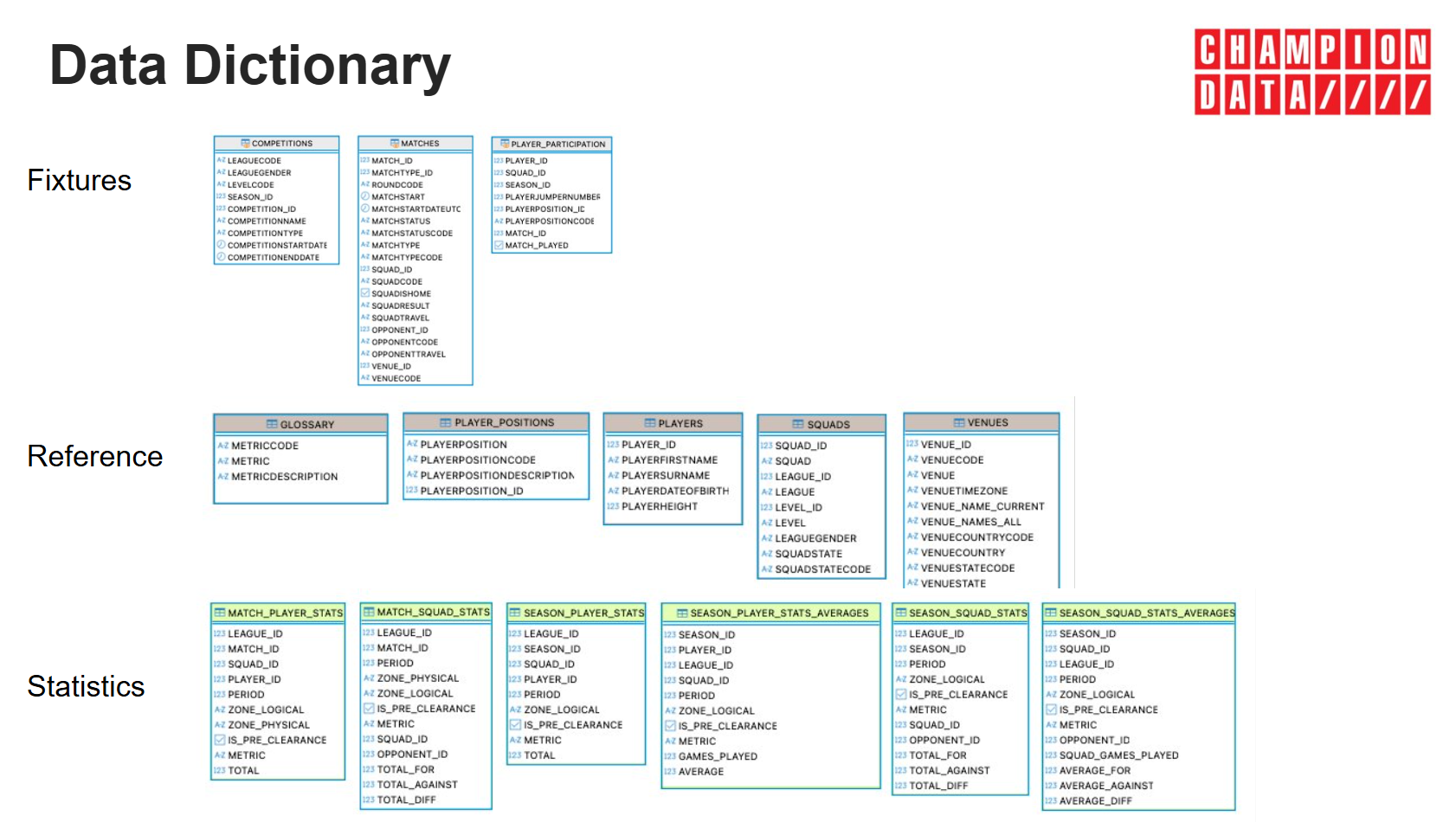 The Warehouse also contains a REFERENCE.GLOSSARY table which lists all the metrics with their descriptions. This will be expanded on next year to match the detail of the AFL API's metric glossary, crucially including each metric's formula where they are generated as a product of other metrics.